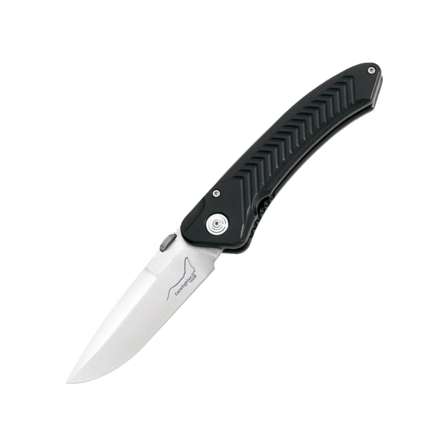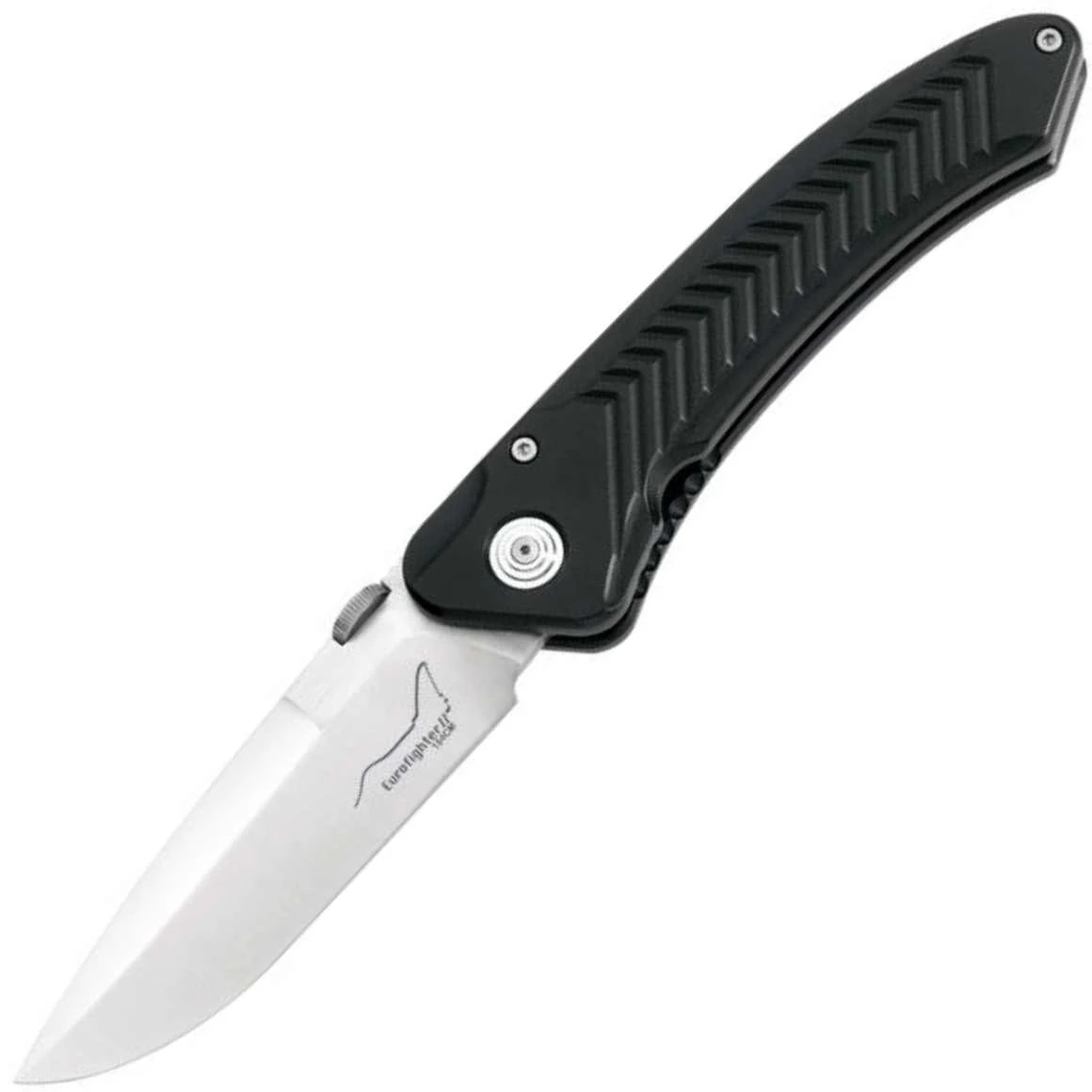 Innovationen sind bei Böker Tradition. Das Eurofighter II Klappmesser bietet eine Vielzahl von technischen und kosmetischen Eigenschaften. Die schlanken Linien des Aluminiumgriffs folgen den glatten Linien der 154 CM Klinge. Der schwarz eloxierte Griff mit Hartbeschichtung liegt perfekt in der Hand. Passend zum innovativen Design wird hier erstmals der Twin-Pin Lock von Böker eingesetzt. Dieser Radialbolzen-Verriegelungsmechanismus unterscheidet sich deutlich von den bisherigen Verschlüssen auf dem Markt und wird über den Klingenstift verriegelt.