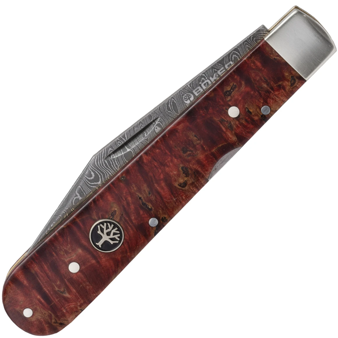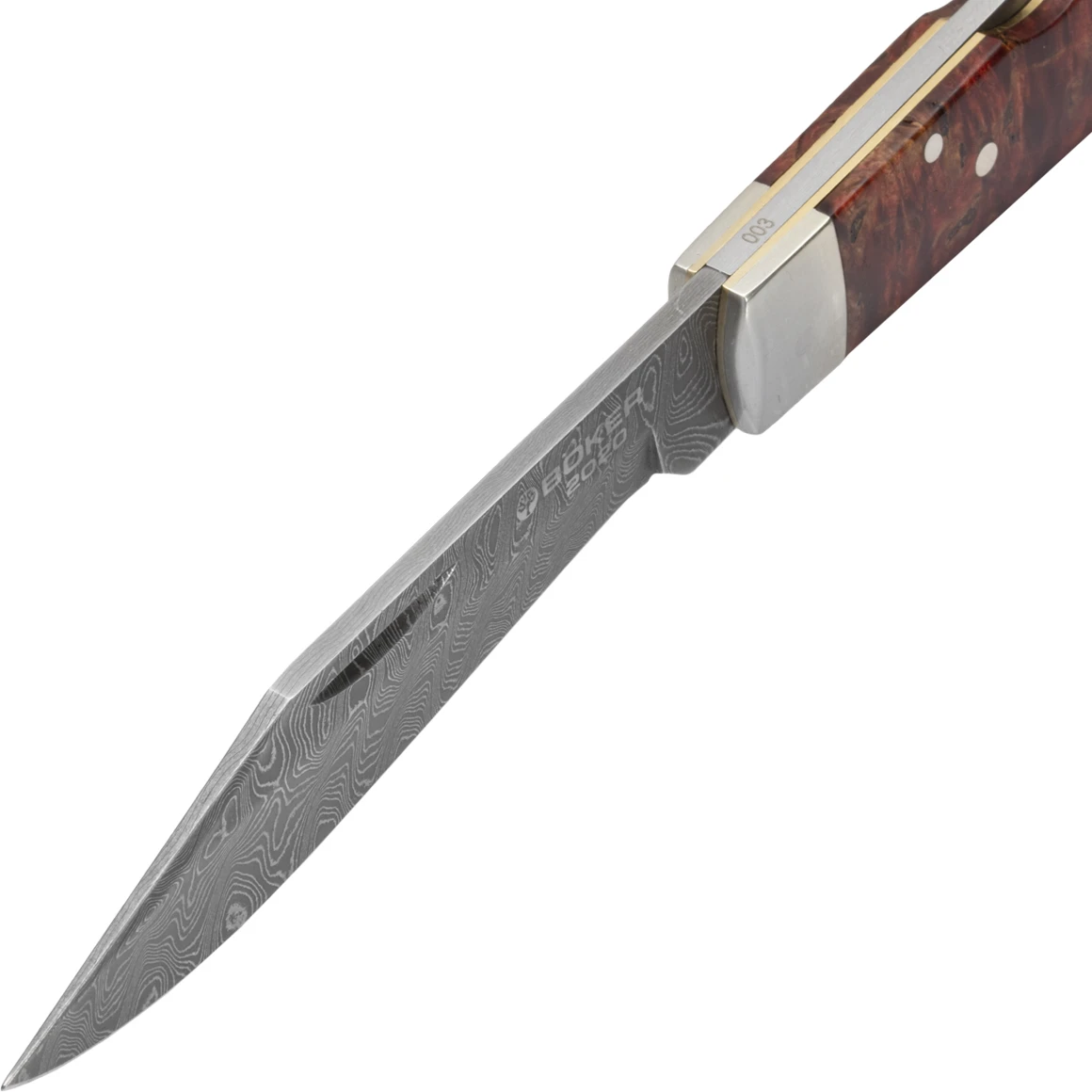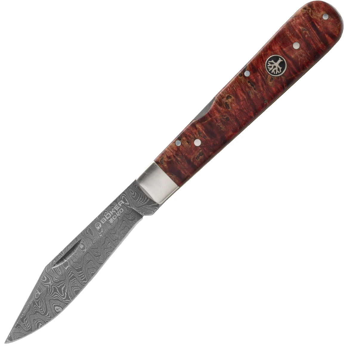 Die Wahl für das Böker Annual Damascus 2020 fiel auf das Modell 1906. Die Neuinterpretation eines traditionellen Messerdesigns aus der Zeit vor der Jahrhundertwende ist heute äußerst beliebt. Es ist ein sehr charismatisches Taschenmesser, dessen unverwechselbare Optik vor allem durch die klaren geraden Linien und den typischen Schliff der Klinge geprägt ist. Handgefertigt in der Böker-Manufaktur in Solingen und streng limitiert auf 999 Messer weltweit.