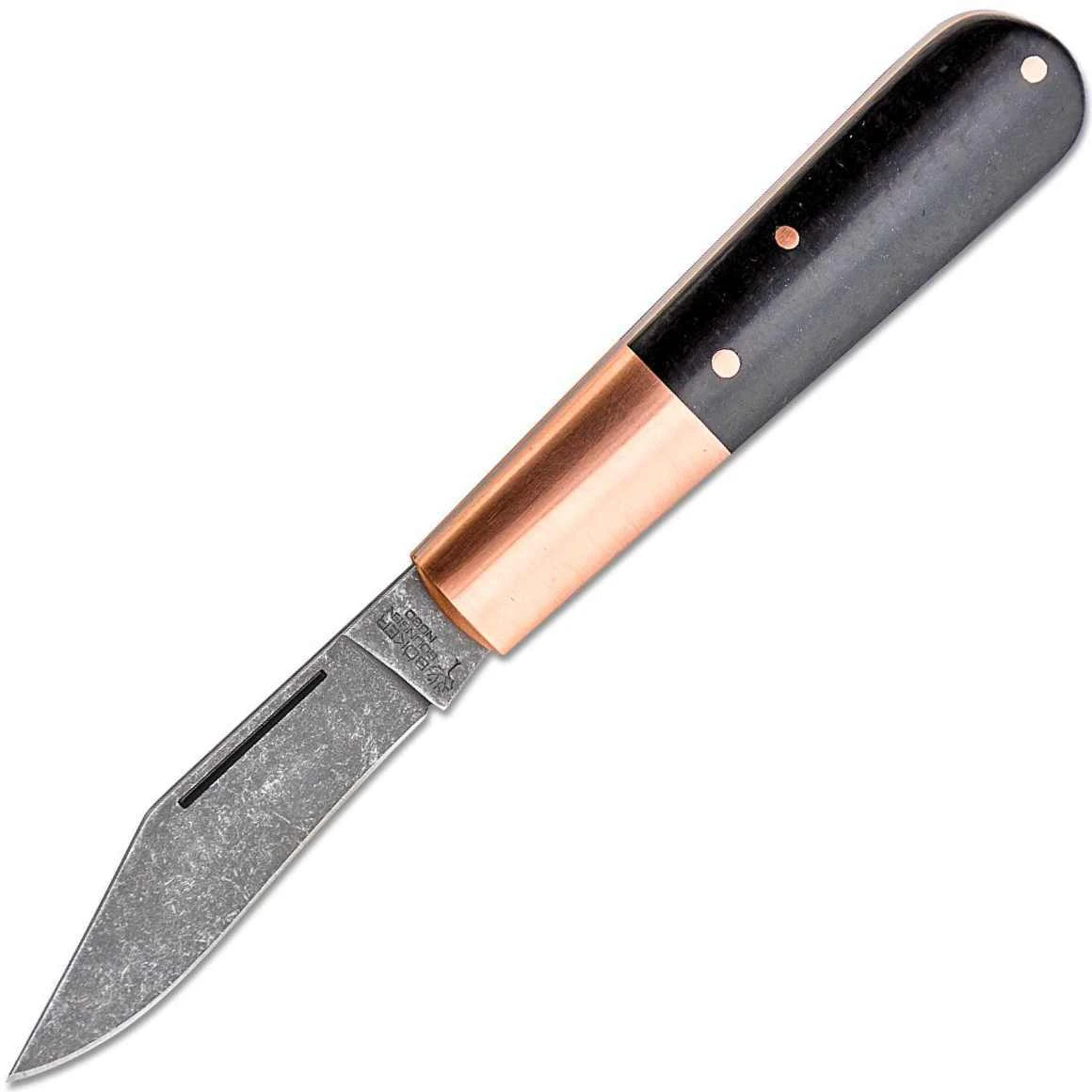 Die aus hochwertigem N690-Stahl gefertigte Klinge öffnet sich mit einer Kerbe in der Klinge und wird durch das Slipjoint-Federsystem in der offenen Position gehalten. Das Messer verfügt nicht über eine echte mechanische Sicherung. Der Griff ist aus strapazierfähigem Micarta und Kupfermaterial gefertigt. Handgefertigt in der Böker-Messer-Manufaktur in Solingen. Mit hochwertiger Filzscheide zur Aufbewahrung.