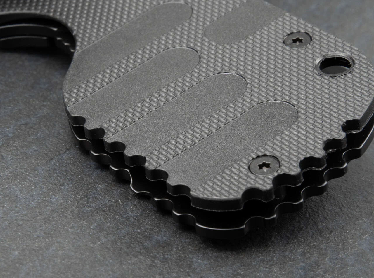 Die kurze Klinge aus hochwertigem D2-Werkzeugstahl wird mit dem Daumen über die Nasen an der Klinge geöffnet. Er wird durch ein Rahmenschloss in der offenen Position gehalten. Der Griff ist aus Zytel und 2 mm dickem Stahl gefertigt. Die Aussparung am Griff, die auch in die Klinge übergeht, trägt zu einer besseren Handhabung des Messers bei. Am Ende des Griffs befindet sich ein Loch für ein Schlüsselband, und das Messer ist mit einem Clip ausgestattet, um es bequem in der Hosentasche tragen zu können.