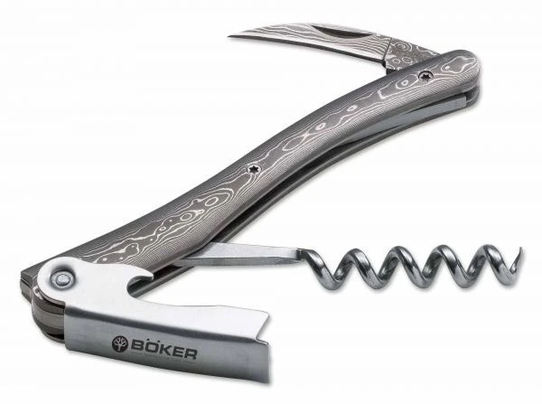 Guter Wein sollte mit Stil geöffnet werden! Der Böker Sommelier Damast hat nicht nur eine kleine Damastklinge zum Öffnen des Flaschenhalses, sondern auch die Klingen dieses Werkzeugs sind aus Damast gefertigt. Der geformte Griff ermöglicht eine gekonnte Handhabung dieses unkonventionellen Multifunktionsöffners. Ein Korkenzieher ist im Griff versteckt.