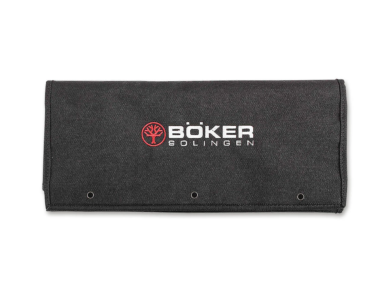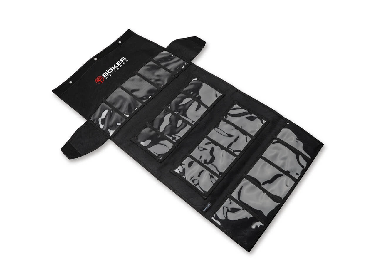 Der praktische Böker Knife Vault Organizer sorgt für Ordnung in Ihrer Sammlung. Um Ihre wertvolle Taschenmessersammlung während der Lagerung oder des Transports vor Kratzern, Schrammen und Schmutz zu schützen, bietet der Messer-Organizer 18 separate Fächer mit einer transparenten Wand. Die äußeren Fächer sind extra breit, so dass auch größere, geschlossene Messer problemlos untergebracht werden können. Die große Klettverschlussklappe hat drei Hohlnieten, so dass der Organizer an der Wand aufgehängt werden kann, um bis zu 18 Taschenmesser repräsentativ zu präsentieren. Ein herausnehmbares Klettfach bietet Platz für Visitenkarten oder Notizblöcke, während die Klettfläche alternativ für Aufnäher genutzt werden kann. Ein gesticktes Böker-Logo rundet den dezenten Look der schwarzen Messertasche elegant ab.