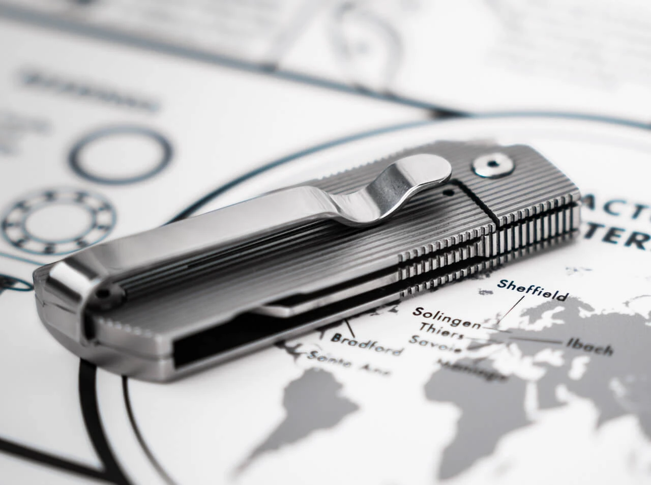 Die Klinge aus D2-Werkzeugstahl lässt sich mit einem Frontflipper öffnen und wird durch einen Framelock-Verschluss in der offenen Position gehalten. Der flache Griff mit Längsrillen ist aus rostfreiem Stahl gefertigt. Das Messer ist mit einem glänzenden Clip zum Tragen in der Hosentasche ausgestattet, und ein praktisches Lanyard-Loch ermöglicht zusätzliche Befestigungsmöglichkeiten.