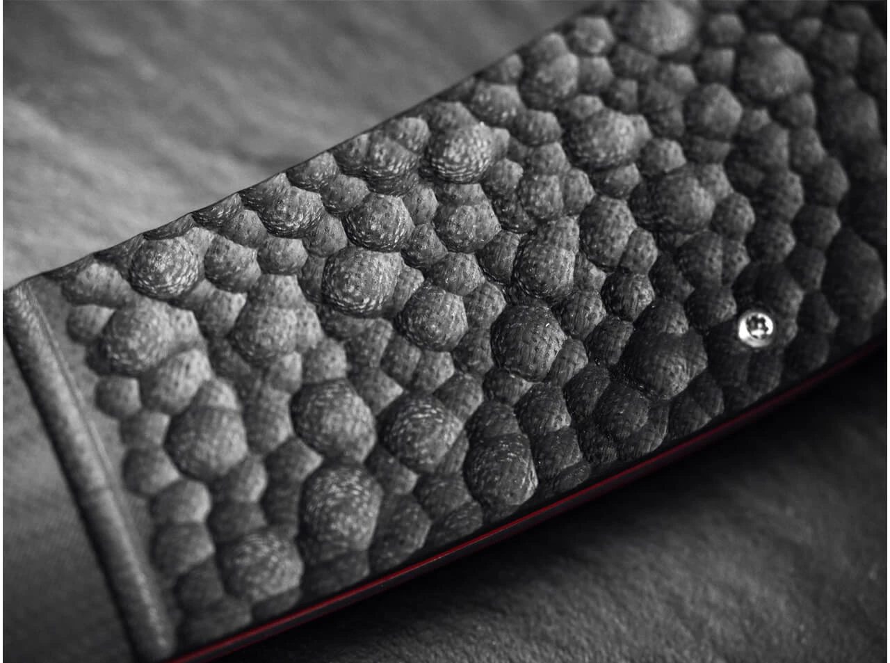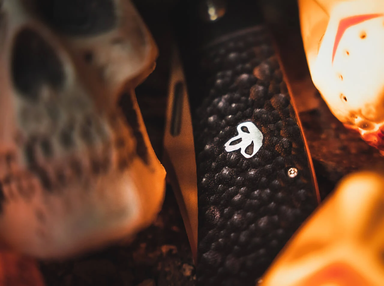Die breite Klinge aus D2-Werkzeugstahl ist mit einer markanten Fehlschärfe versehen. Das Messer öffnet sich durch eine Kerbe in der Klinge und wird durch das Slipjoint-Federsystem in der offenen Position gehalten. Das Messer ist nicht mit einer echten Sicherung ausgestattet. Die G10-Klingen haben eine raffinierte Textur, die an rustikales Leder erinnert. Falsche Backen, eine Schicht aus rotem G10 und ein stilisiertes Totenkopf-Emblem auf der Vorderseite unterstreichen den provokativen Charakter des Messers. Das Messer ist mit einem Lanyard-Loch ausgestattet.