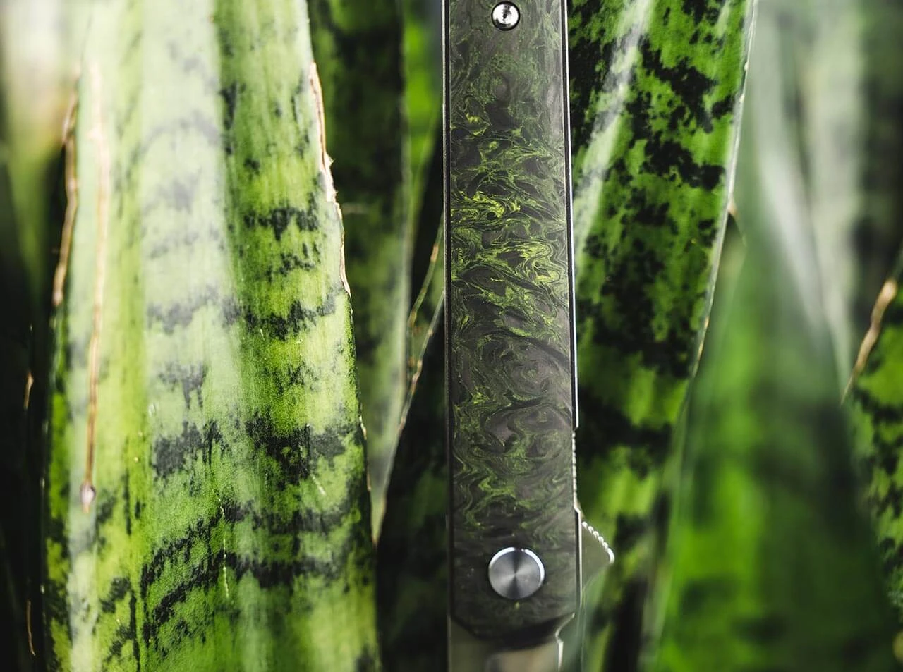 Die Klinge ist aus hochwertigem M390-Stahl gefertigt. Der Flipper sorgt für eine intuitive Steuerung, während das Framelock aus Titan mit Edelstahlliner und Überlaufschutz die Klinge in geöffneter Position sicher arretiert. Die Einzigartigkeit des Messers wird durch den wilden Kohlefaser-Griff mit grün gefärbten Einschlüssen unterstrichen. Die Titan-Schließe für das Tragen in der Tasche ist aus einem Stück gefräst.