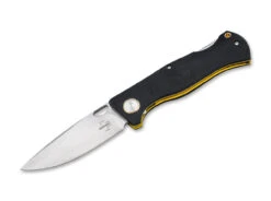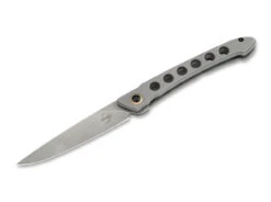 Die Klinge aus hochwertigem N690-Stahl öffnet sich mit einer Kerbe in der Klinge. Sie wird durch eine Backlock-Verriegelung in der offenen Position gehalten. Der Griff ist aus strapazierfähigem Micarta mit dekorativen Kupfernieten gefertigt.